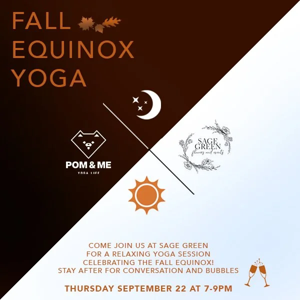 The fall equinox is such and amazing time of the year, a rebirth of the seasons! Join me at Sage Green Floral Shoppe to take it all in! we’ll start with an hour long relaxing yoga session, and finish with good conversation and bubbles!! I hope to see you there!